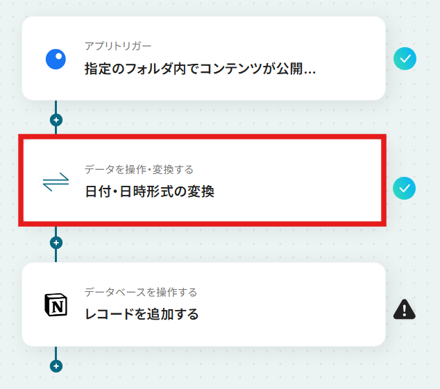 - 次に、オペレーションでデータ操作・変換の「日付/日時形式の変更」を設定し、取得した公開日時をNotionに記録したい形式に整えます。