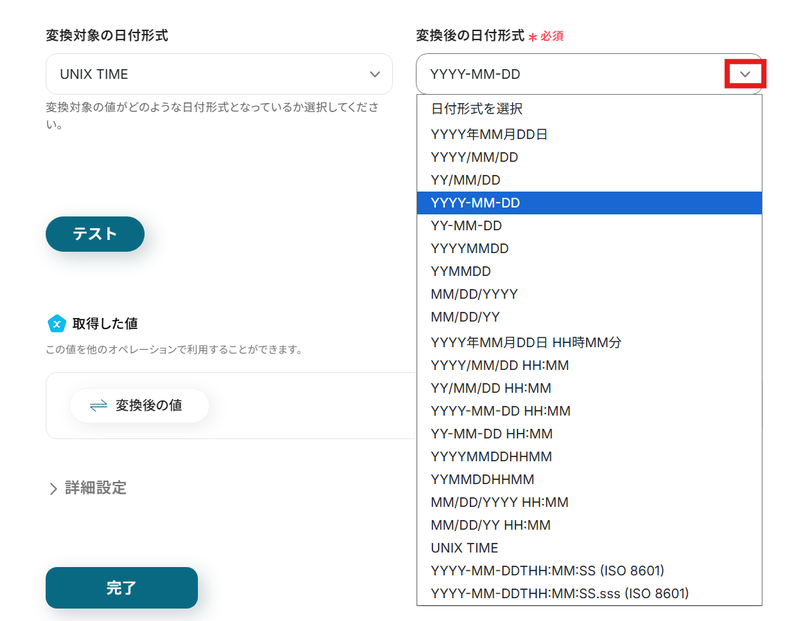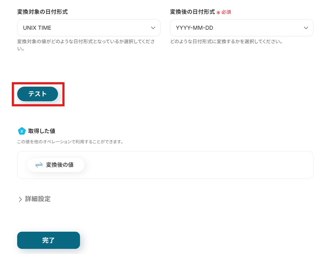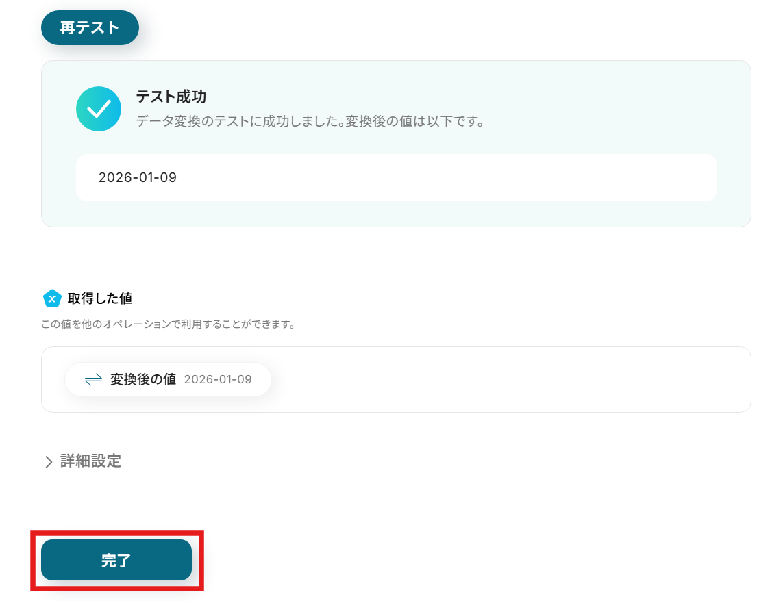 テストが成功すると、テスト成功画面に変換後の日付が表示されます。問題がなければ「完了」をクリックして次へ進みましょう。