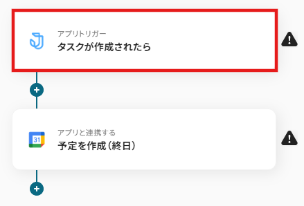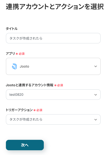 タイトルと連携するアカウント情報を任意で設定し、トリガーアクションはテンプレート通りに「タスクが作成されたら」のまま「次へ」をクリックして進んでください。