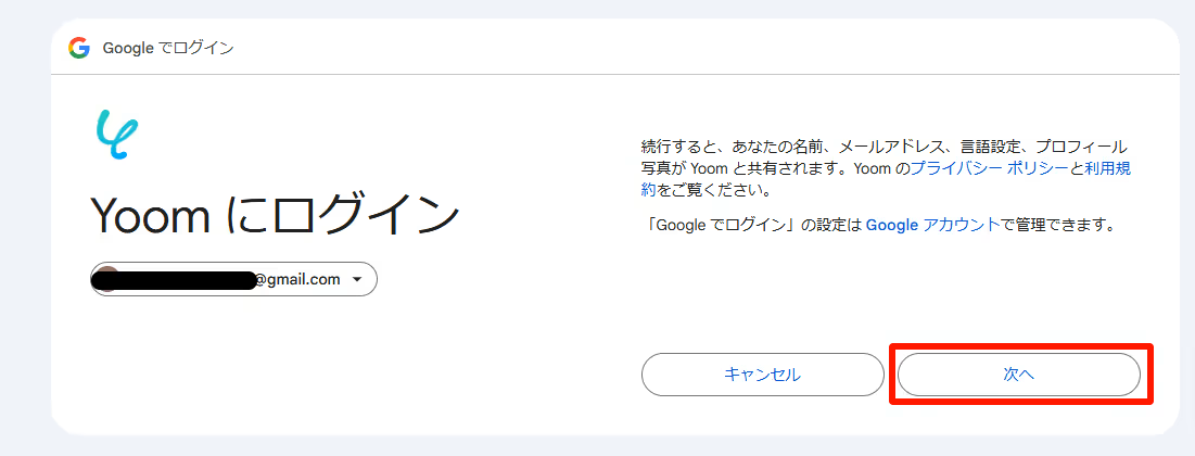 Googleアカウントを選択して「次へ」をクリックします。