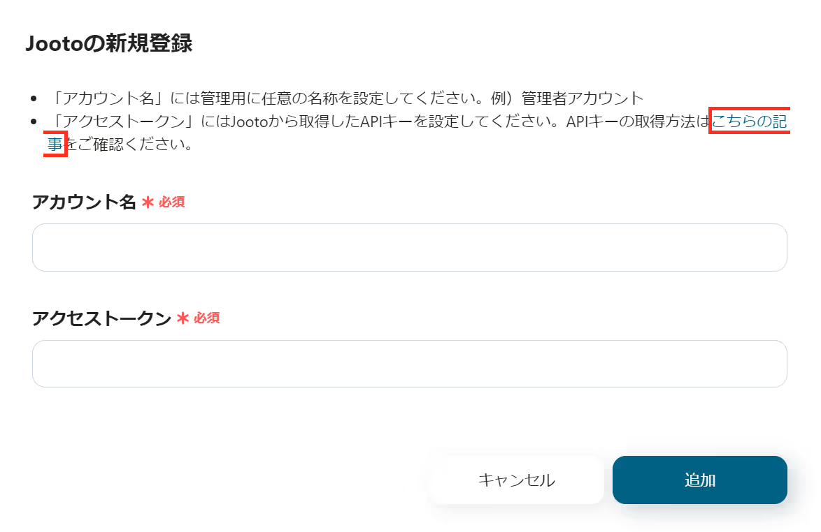 「Jootoの新規登録」画面でアカウント名、アクセストークンを入力して「追加」を押します。