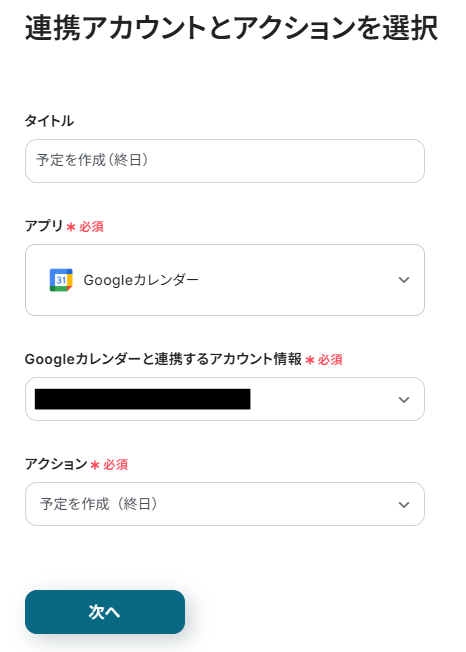先ほどと同様にタイトルと連携するアカウント情報を任意で設定し、アクションはテンプレート通りに「予定を作成(終日)」のまま「次へ」をクリックして進んでください。