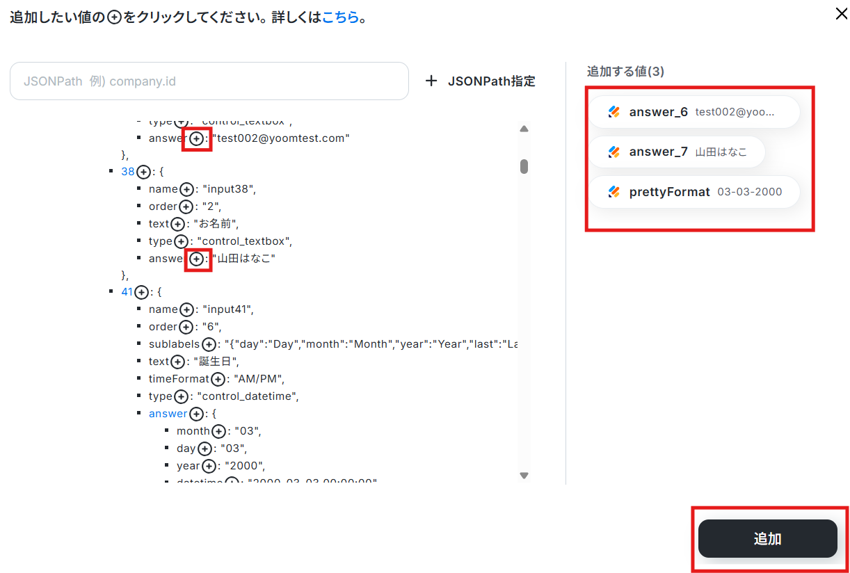 【補足】 今回、誕生日の項目には「prettyFormat」(可読性が高い形式)の値を選択しました。 「+」のついている部分が追加できる場所なので、必要に応じて任意の項目を選んで追加してください。