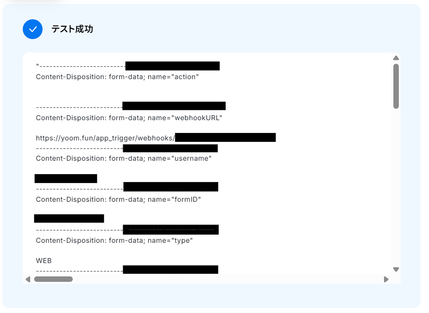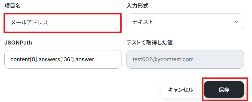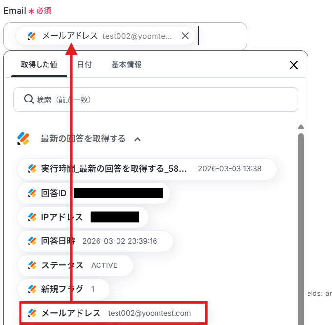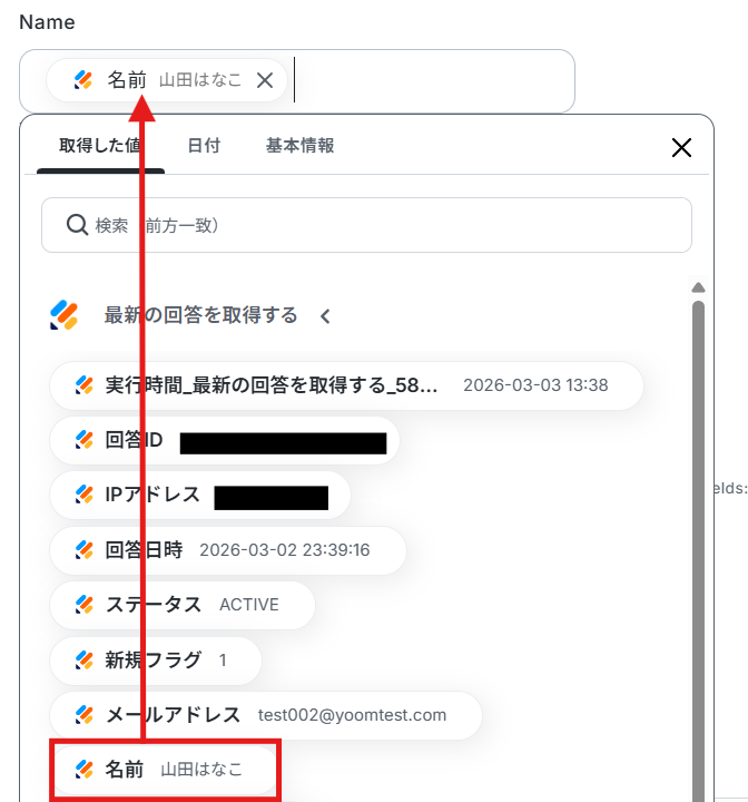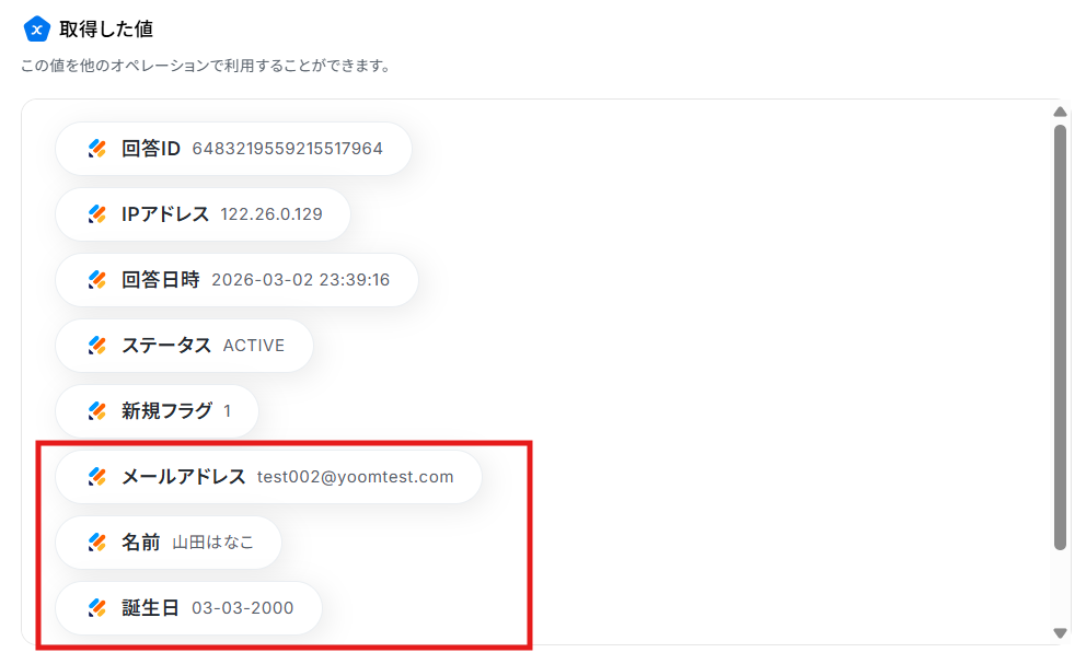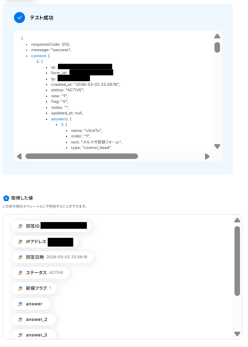 フォームIDの入力が完了したら、テストを実行します。 テストに成功すると取得した値の横に、Jotformに送信した回答内容が表示されます。