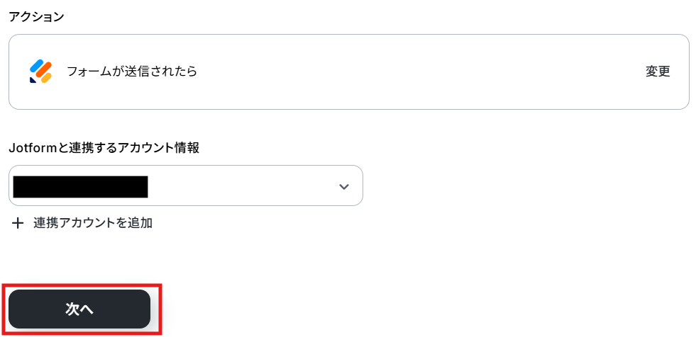 クリックすると以下の画面に移ります。 アカウント情報と書かれた項目にはステップ1でマイアプリ連携した際の情報が記載されています。 アクションは、「フォームが送信されたら」のままで次に進みましょう!