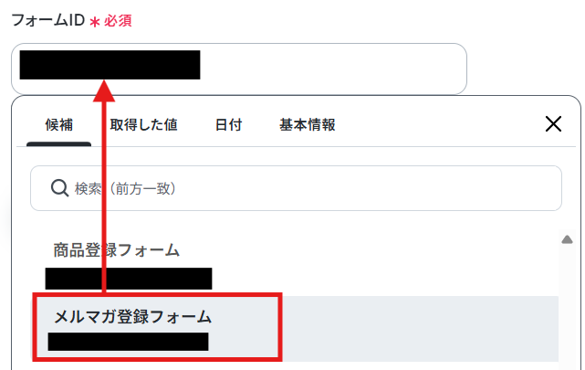 編集欄をクリックすると、連携したJotformアカウントのフォーム候補が表示されます。 その中から、先ほどWebhookを設定したフォームを選択してください。 選択すると、自動でフォームIDが反映されます。