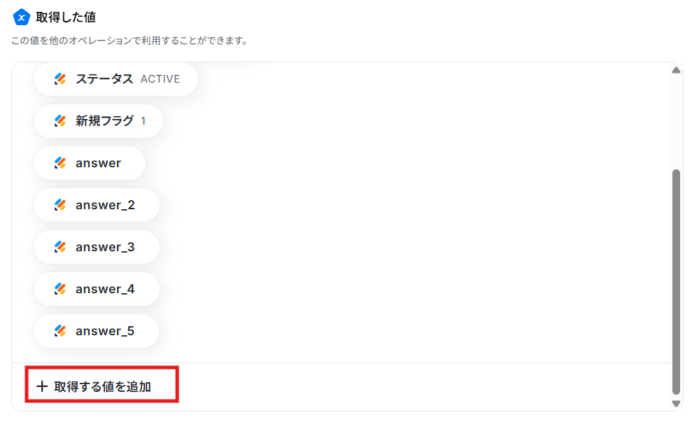 Jotformで、デフォルトで取得できる値は、「回答ID」「IPアドレス」「回答日時」「ステータス」「新規フラグ」のみなので、ユーザーの回答内容を取得するためには、手動で値を追加する必要があります。 「取得する値を追加」をクリックし、取得した値を追加しましょう。