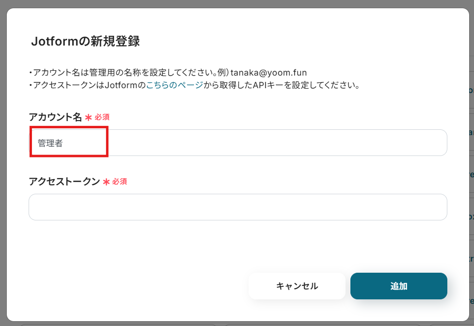 アクセストークンにコピーしたAPIキーを貼り付けて、「追加」をクリックします。