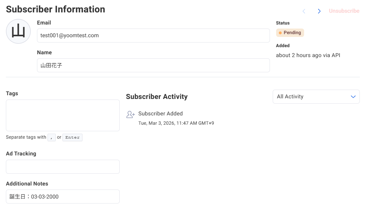 AweberにSubscriberが作成されました!