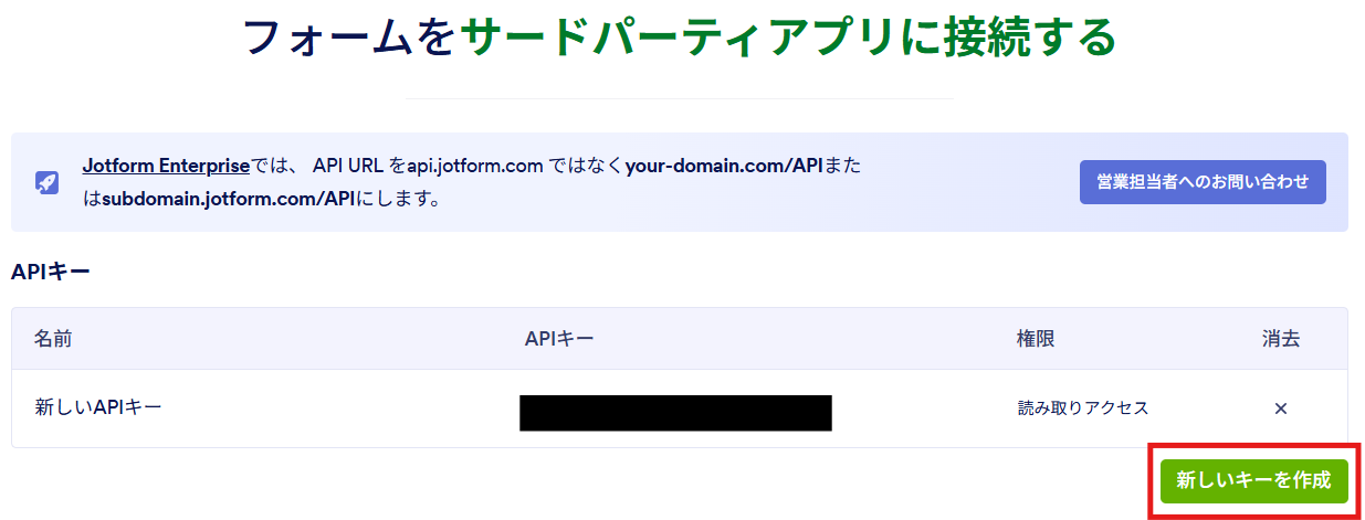 アクセストークンは、Jotformから取得します。 こちらのページ に移動し、「新しいキーを作成」をクリックして、APIキーを作成しましょう。 作成したAPIキーをコピーして、Yoomの画面に戻ります。