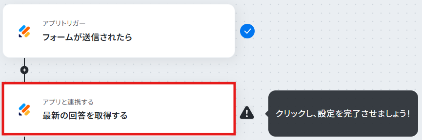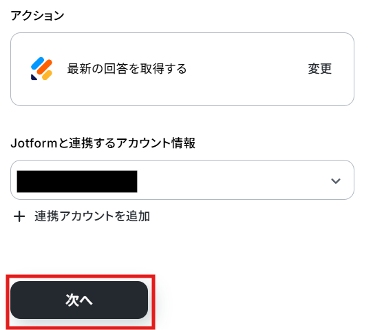 クリックすると以下の画面に移ります。 こちらも、ステップ1でマイアプリ連携したアカウント情報が自動で表示されます。 アクションは、「最新の回答を取得する」のまま次に進みましょう!