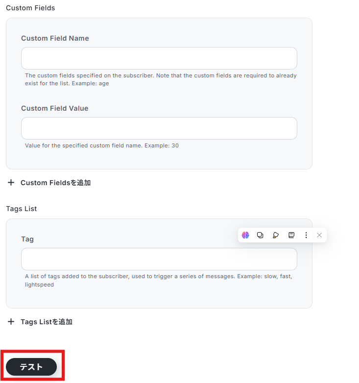 下記を任意で設定して、テストを実行してください。※プルダウンや固定値で設定した項目は、今後このフローで追加されるすべてのサブスクライバーに適用されます。
