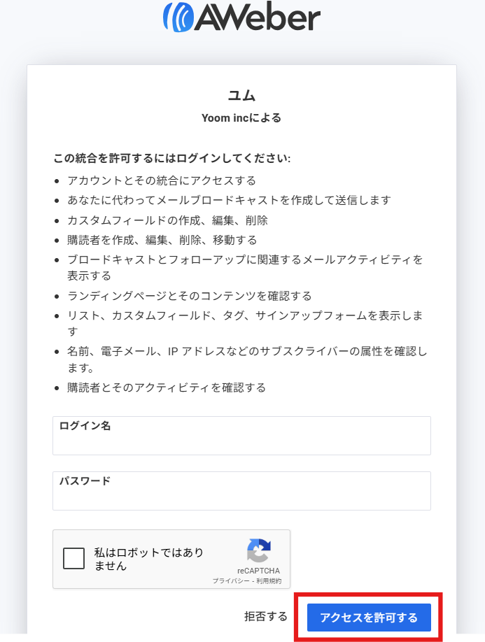 Yoomと連携したいアカウント情報を入力して、「アクセスを許可する」をクリックします。