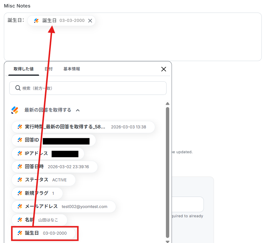 Misc Notes(メモ)や、カスタムフィールドは、誕生日など、任意で設定した質問の回答を連携することができます。