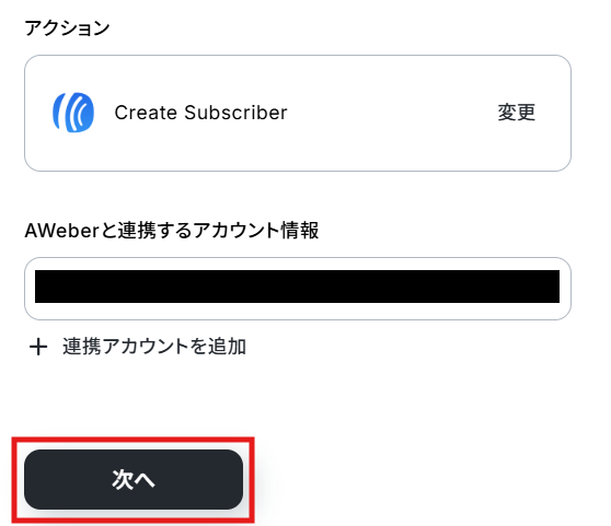 クリックすると以下の画面に移ります。 Jotformと同様に、ステップ1でマイアプリ連携したAweberのアカウント情報が自動で表示されます。 アクションは、「Create Subscriber」のままで次に進みましょう!