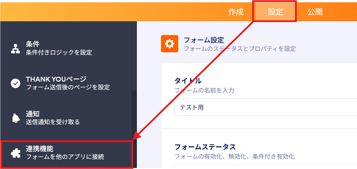 該当フォームの「設定」>「連携機能」から、「Webhook」を選択すると設定が行えます。