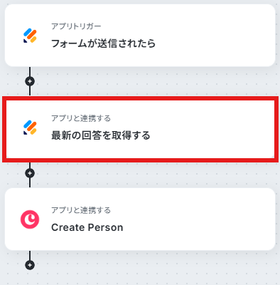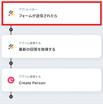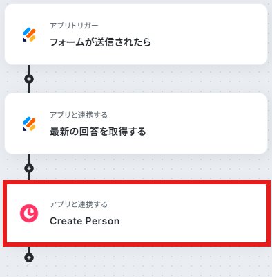 - 最後に、オペレーションでCopperの「Create Person」アクションを設定し、取得した回答情報をもとにPersonを作成します。
