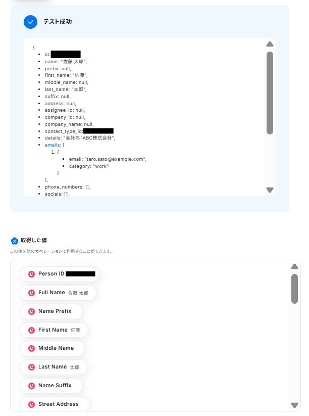 - CopperでPersonの情報を取得するオペレーションでは、対象となるIDをトリガーの情報から引き継ぐだけでなく、特定のIDを固定値として設定することもできます