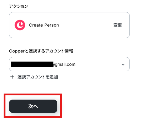 アクションはデフォルト設定のまま、アカウント情報は、連携したいアカウントが選択されているか確認してください。確認出来たら「次へ」をクリックしましょう。
