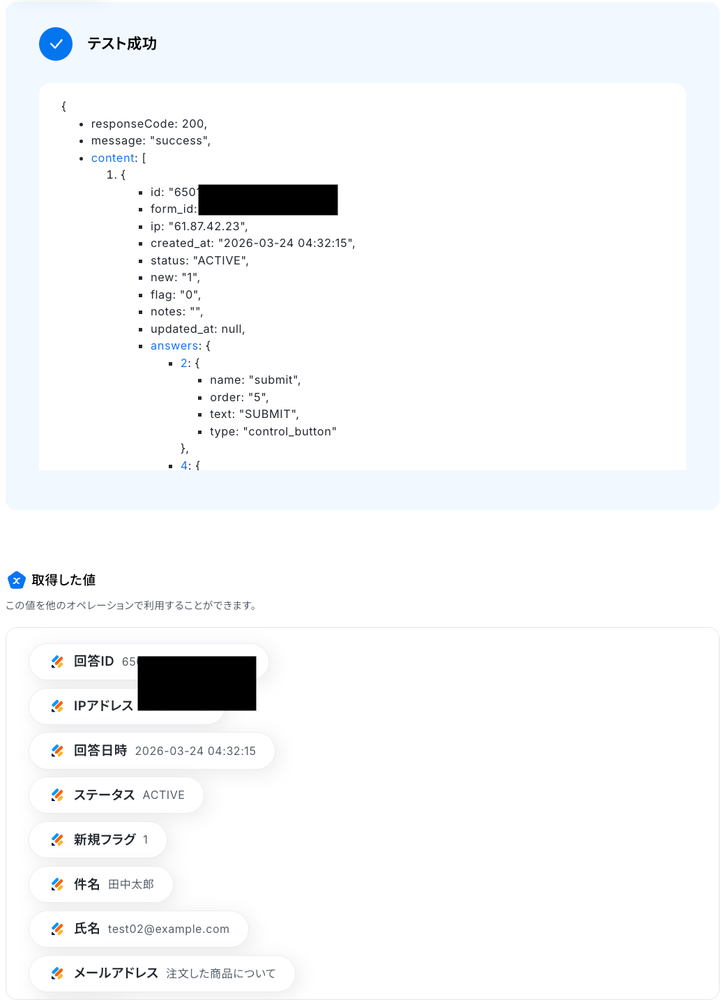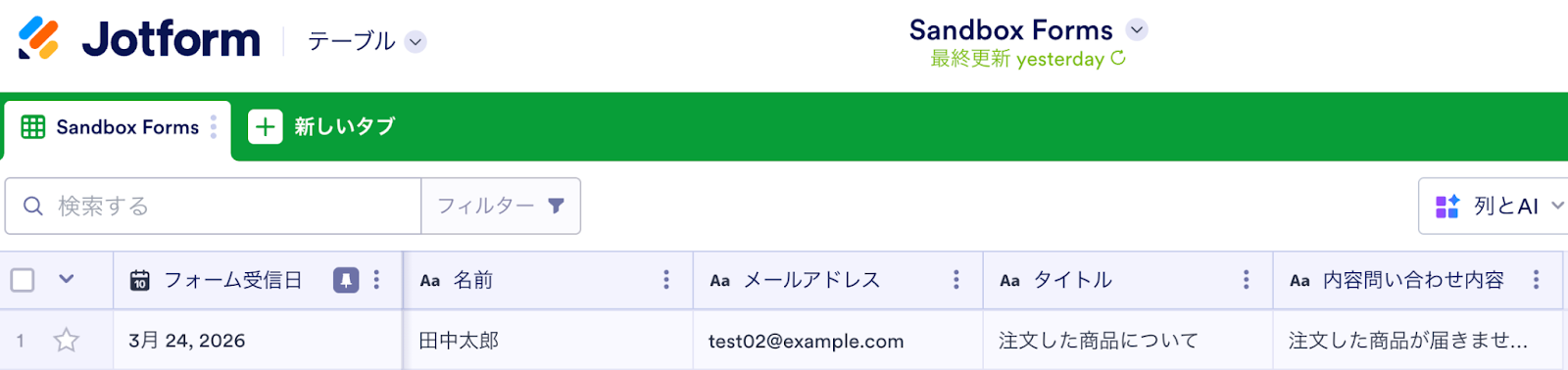 テストに成功すると、Jotformで送信された回答に関する情報が一覧で表示されます。