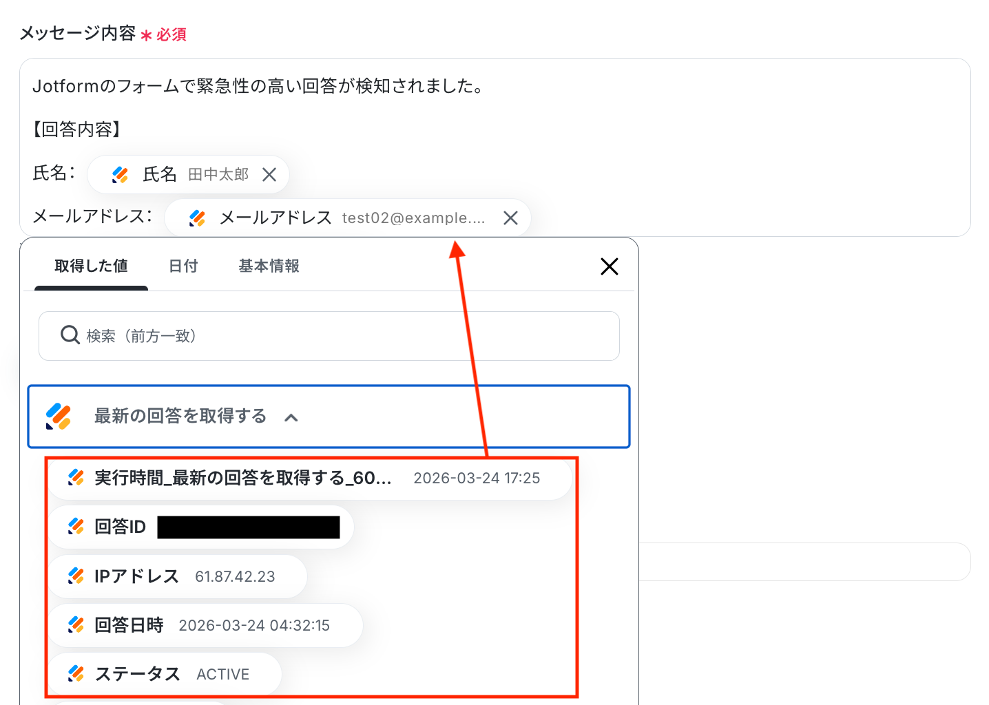 入力欄をクリックすると、前のステップでJotformから取得した値が表示されるので、選択して入力しましょう。