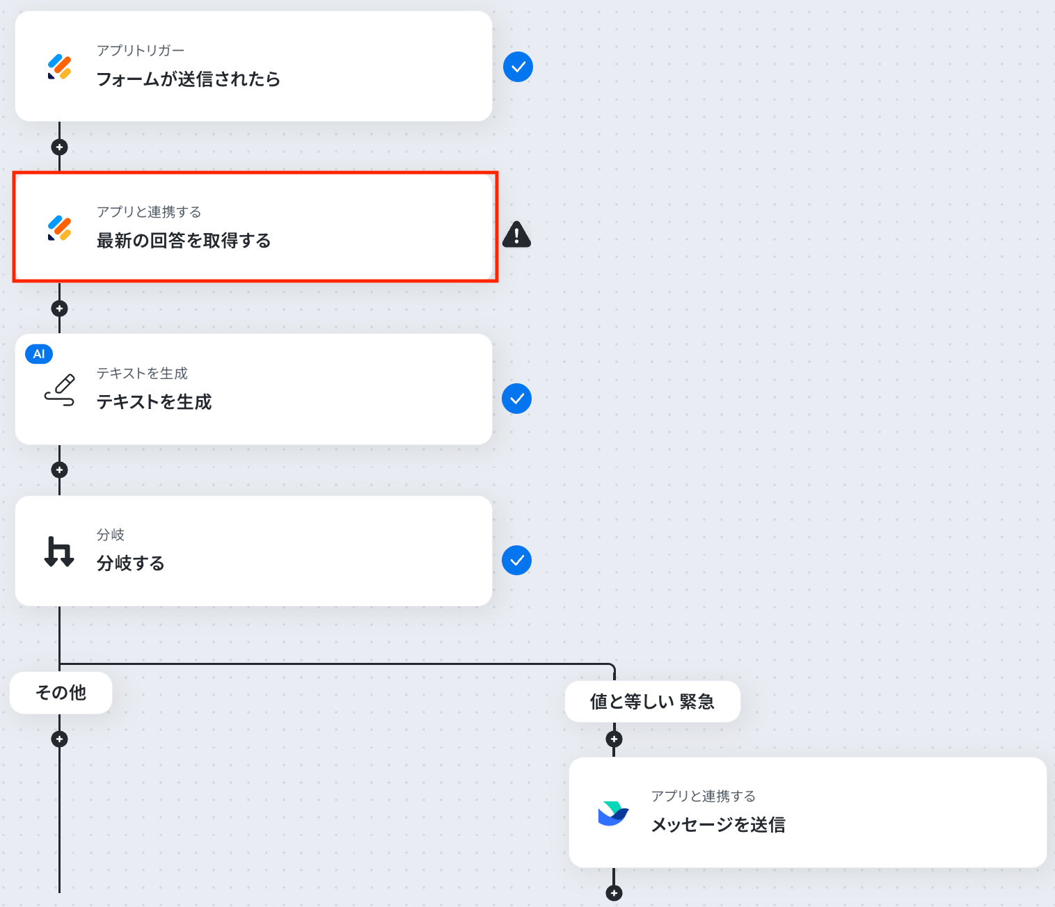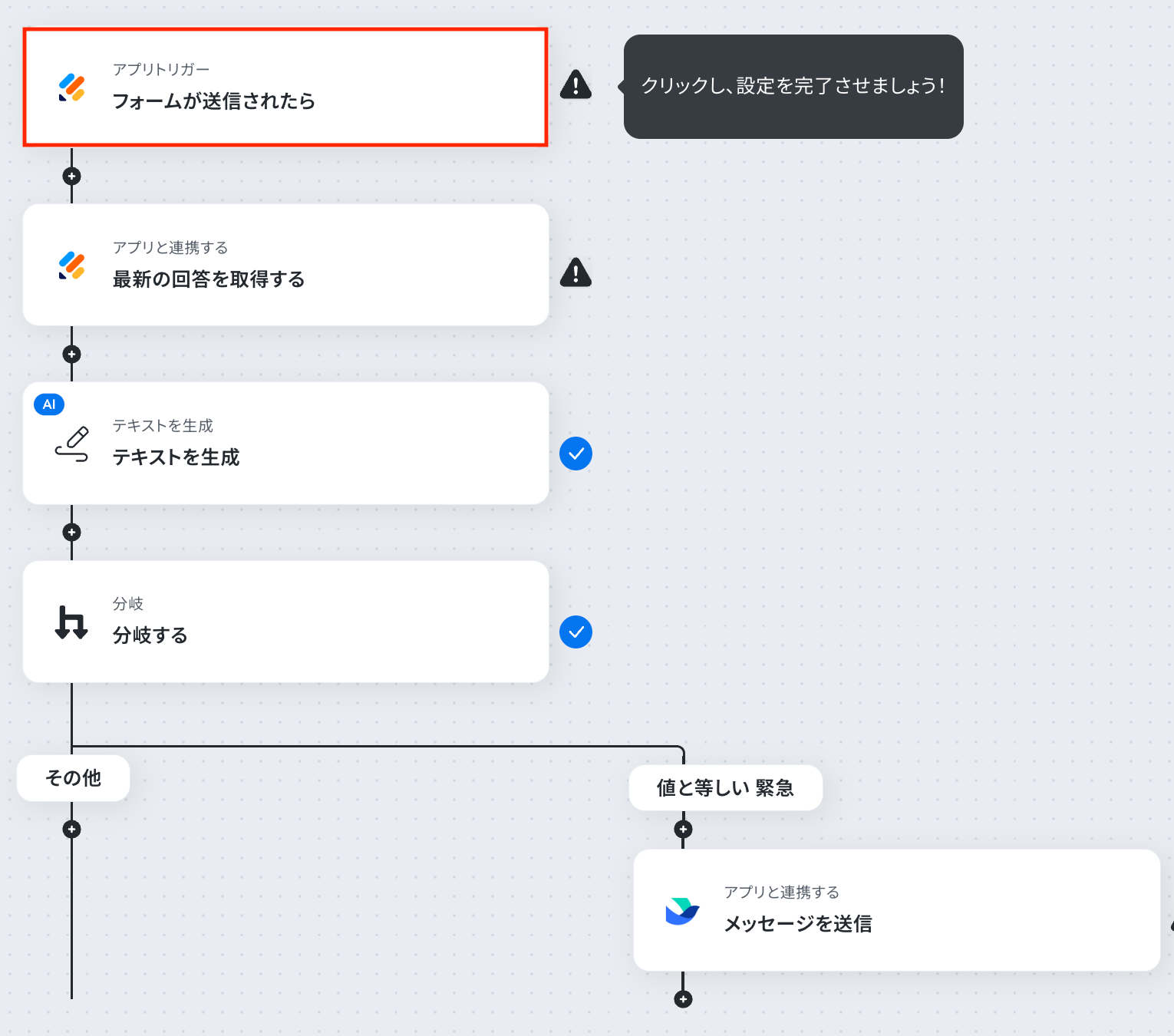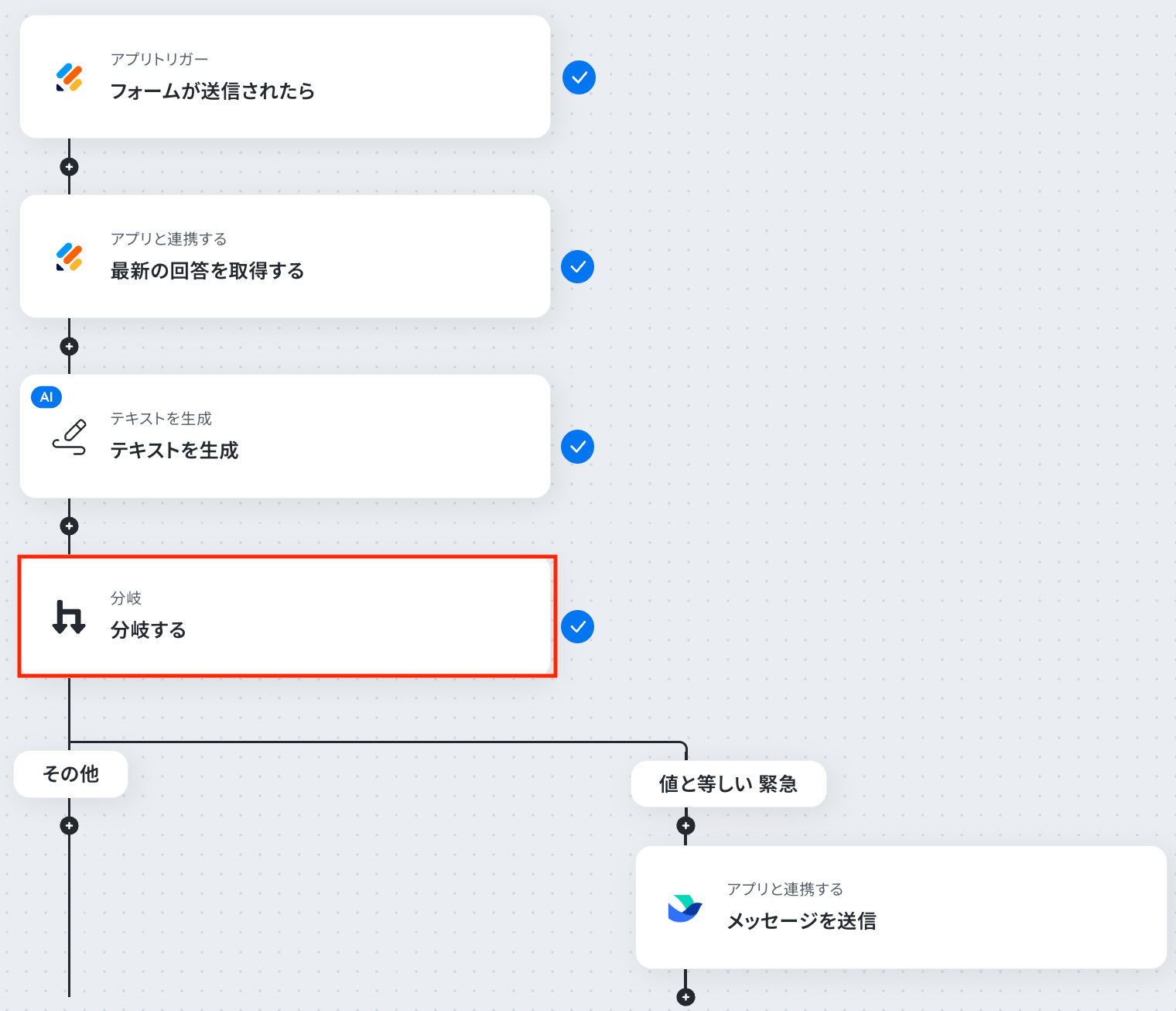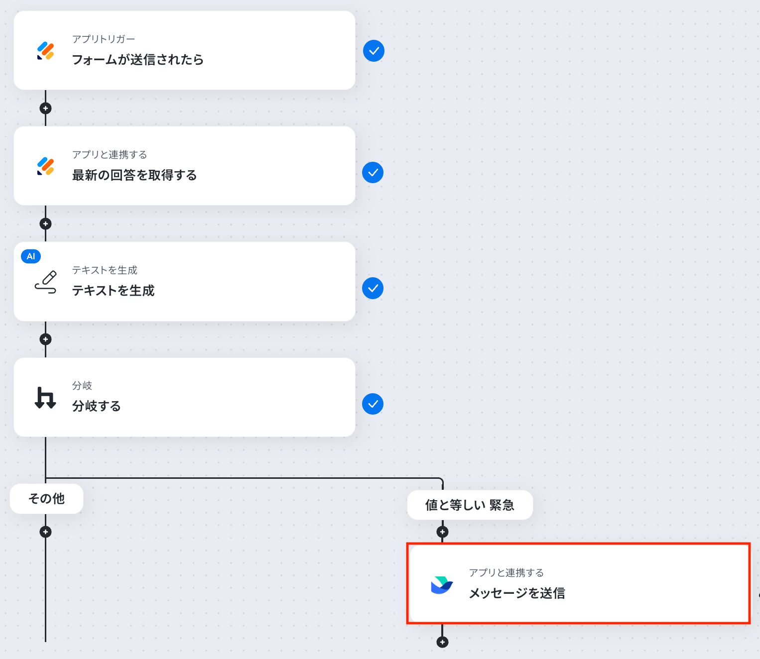 この設定により、AIがJotformの回答をもとに生成した結果が「緊急」である場合のみ、後続の処理が実行されるようになります。