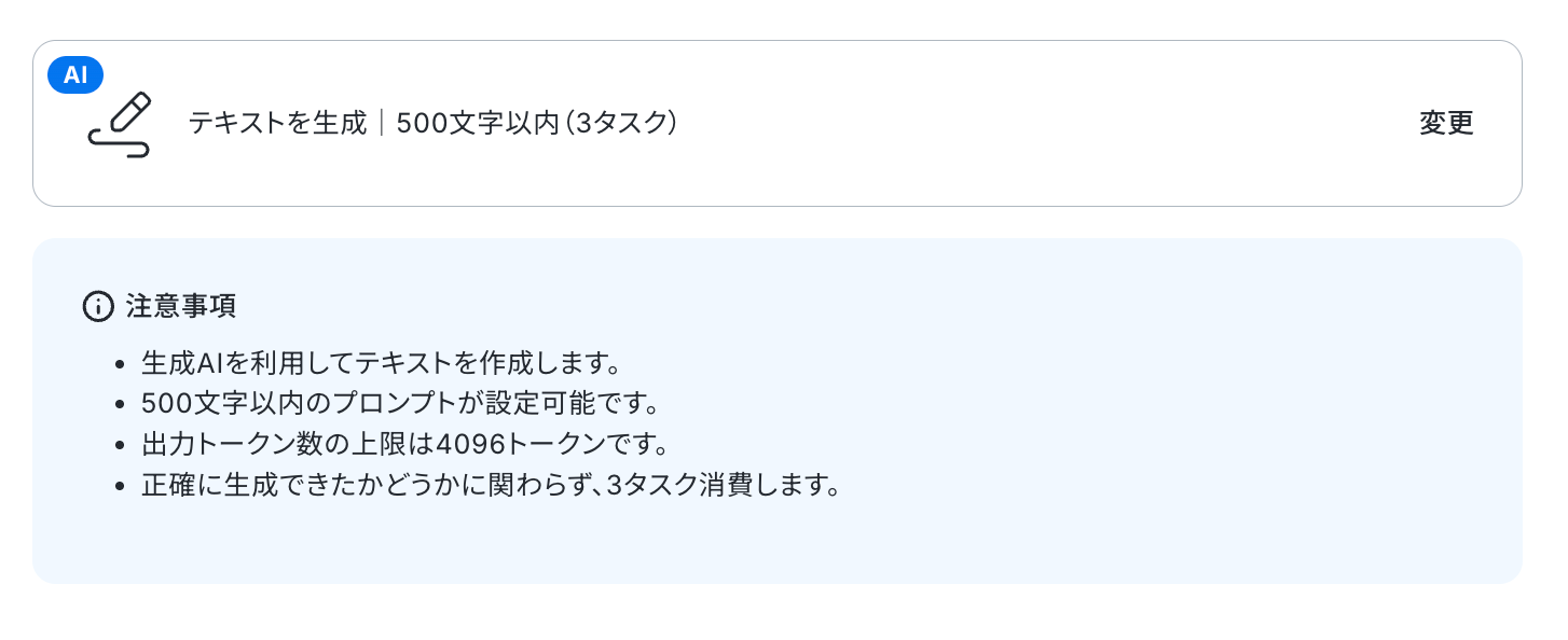 テキストを生成するアクションは、指示可能なプロンプトの文字数によって消費するタスクが異なります。