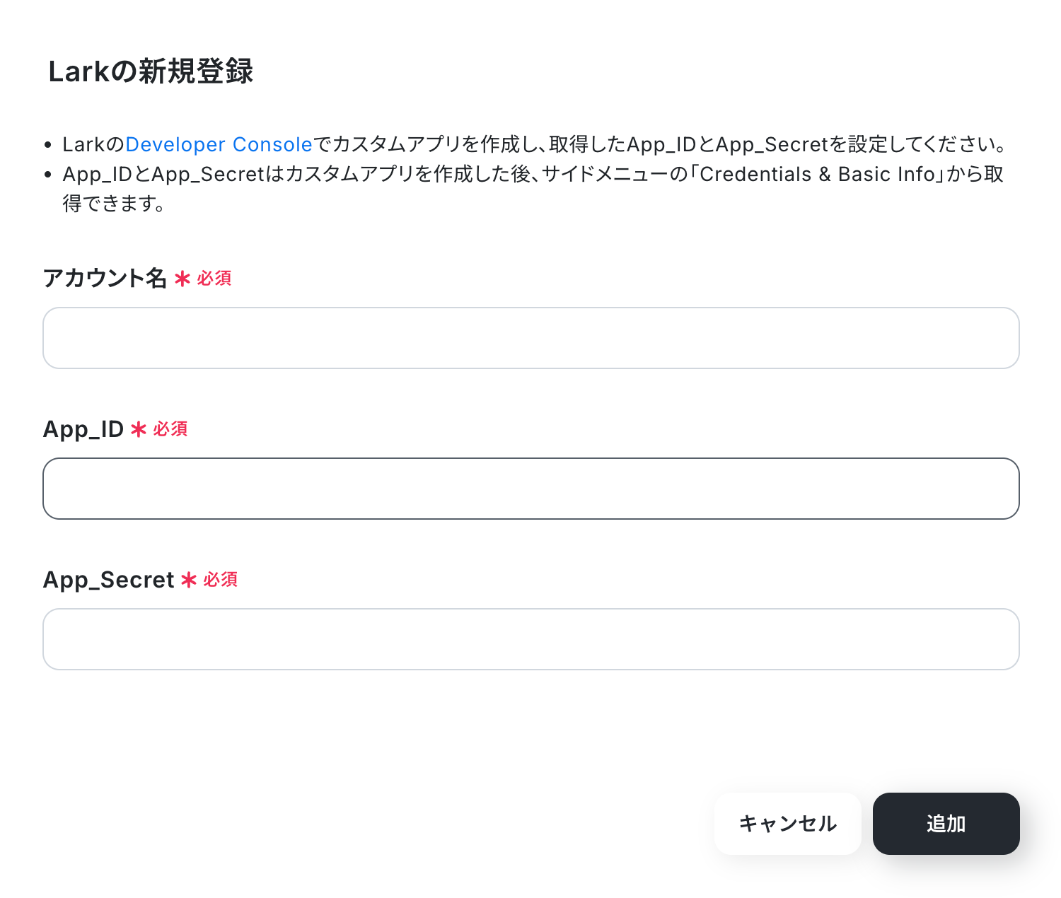 以下の画面が表示されるので、アカウント名、App_ID、App_Secretを注釈に沿って入力し、「追加」をクリックしましょう。