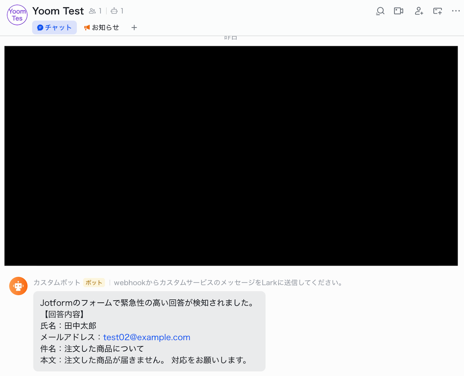 実際にJotformでテスト回答を送信し、Larkに通知が届くかを確認してみましょう。