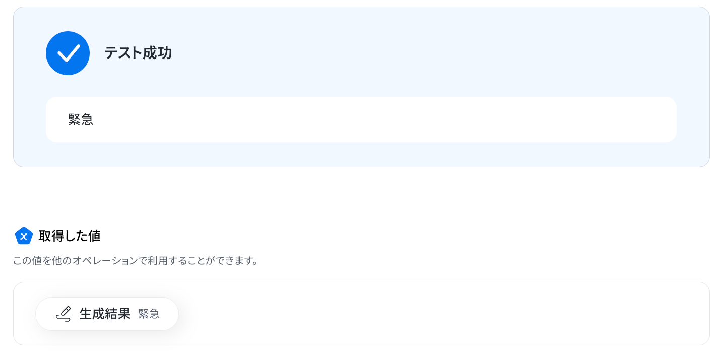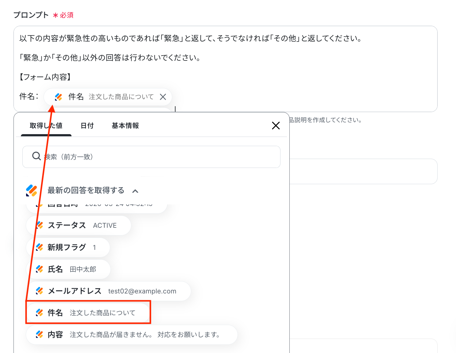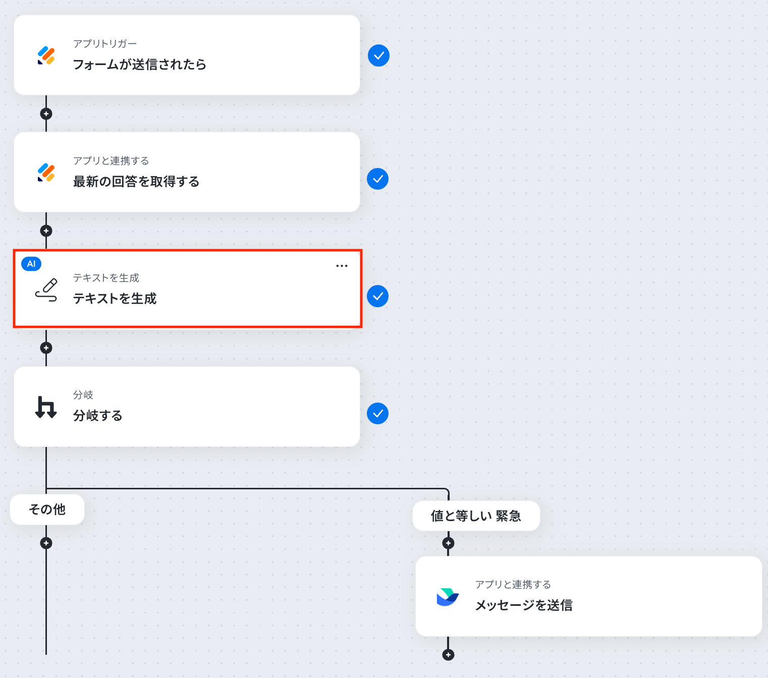 続いて、前のステップでJotformから取得した値をもとに、問い合わせ内容の緊急性が高いかどうかを判断するテキストを生成しましょう。