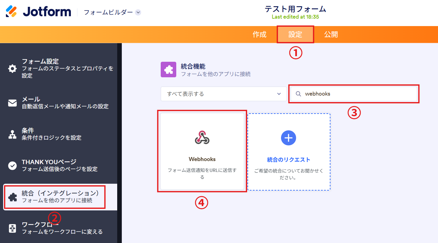 まずは、JotformにWebhook URLを設定しておきましょう。
