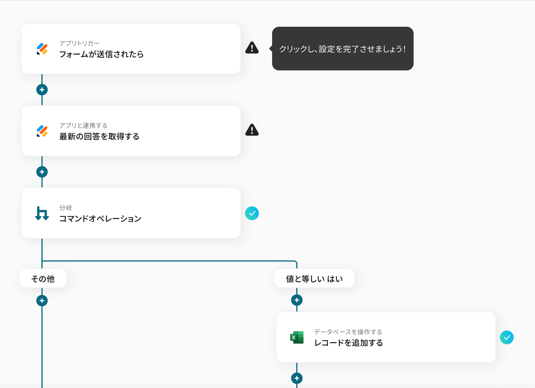 以下は、特定の回答が「はい」と記載された場合のみMicrosoft Excelに連携する例です。