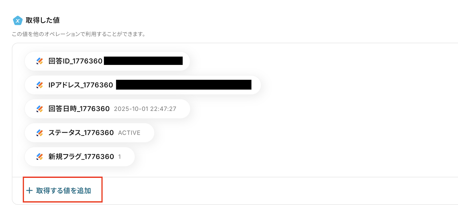 本来テストが成功したら、取得した値に情報が追加されますがJotformは手動で追加する必要があります。 「取得した値を追加」をクリックして、Jotformの回答情報を、取得した値に追加しましょう。 手順は以下のヘルプページを参考に進めてください。