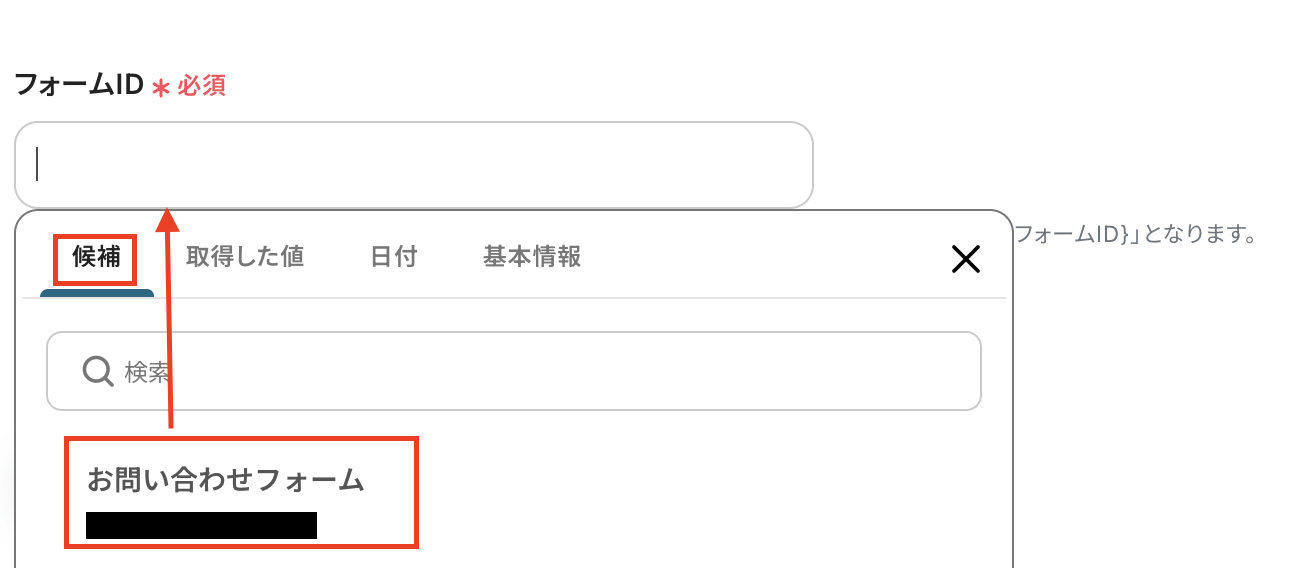 フォームIDは、トリガーで回答したフォームを候補から選択しましょう。 候補は、マイアプリに登録したアカウントに紐づいて表示されます。