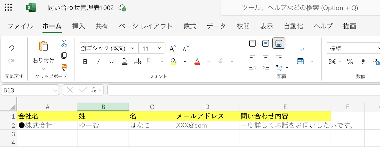 Microsoft Excelのレコード情報が表示されていると思います。 各項目に、Jotformで取得した値を追加しましょう。 値を手入力すると、同じ内容を繰り返し追加することになりますので注意してください。 追加したい項目に取得した値を選択できたら、テストを実行しましょう。