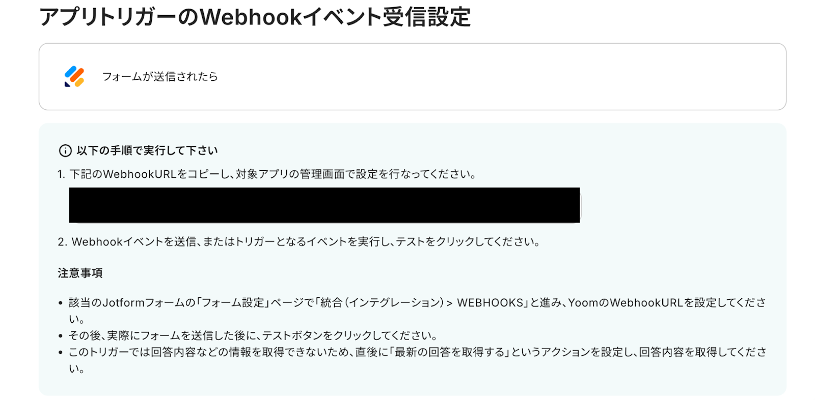 WebhookURLをコピーし、Jotformで設定しましょう。