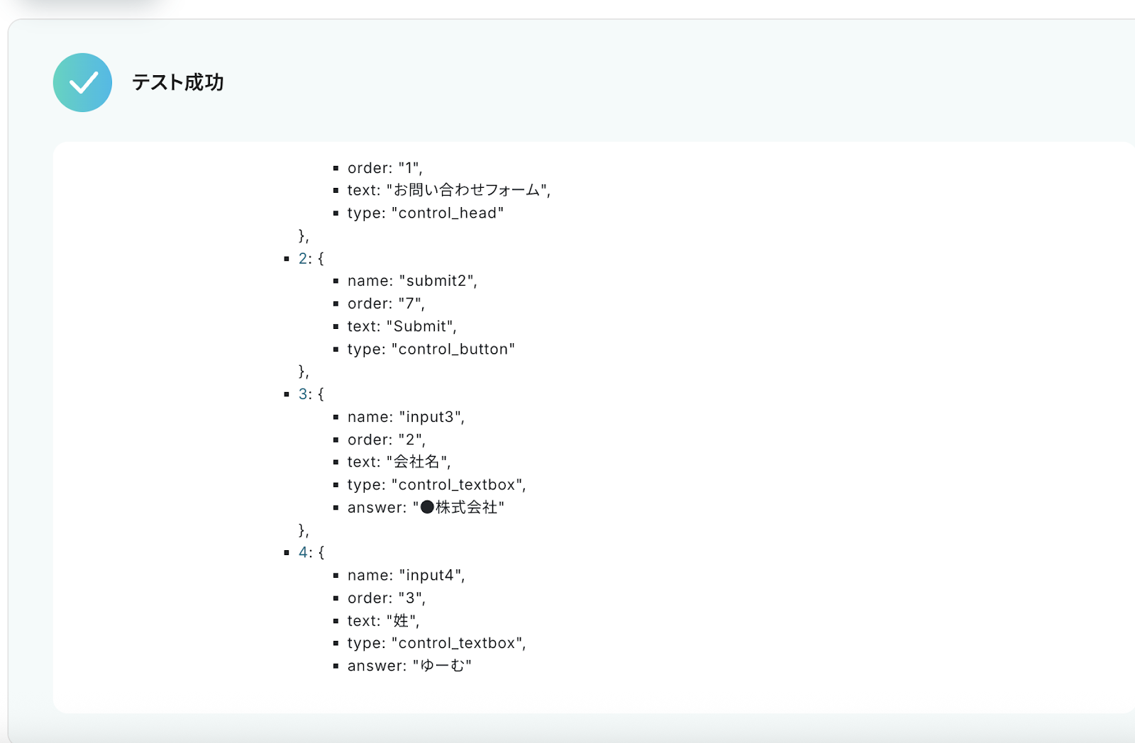 テスト成功と表示されますが、取得した値が空の状態です。 次のJotformのアクションで詳細を取得しますので、ここまま保存でOKです。