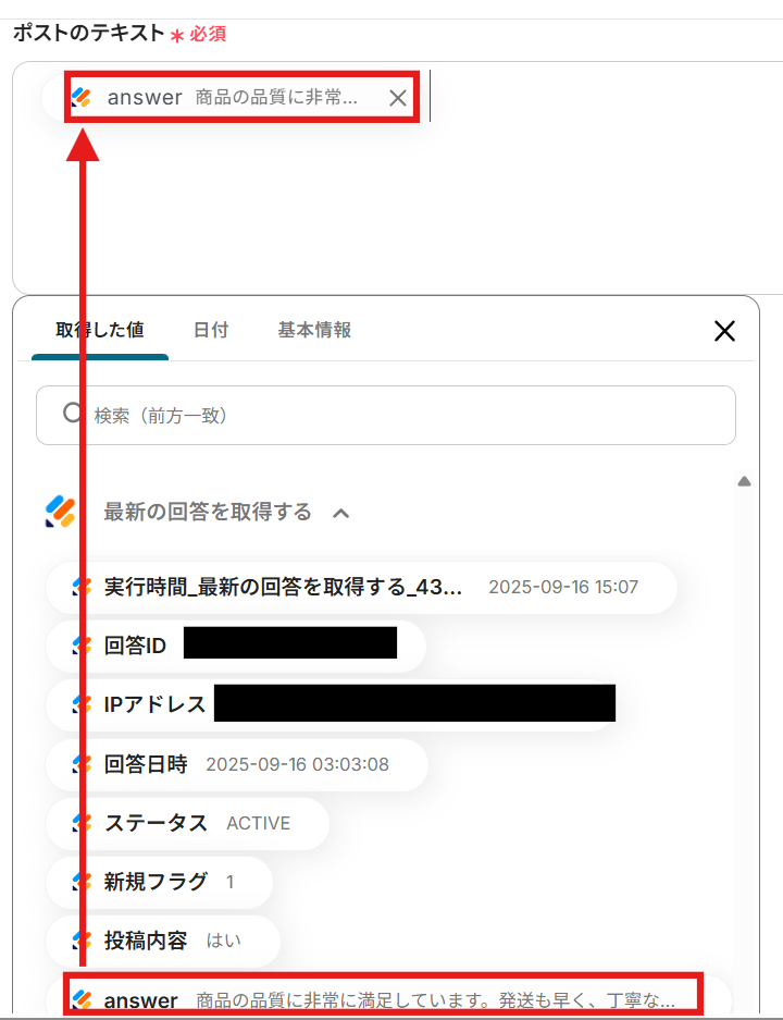 - X(Twitter)に投稿するテキスト内容は、Jotformの回答内容などを組み合わせて任意で設定してください。