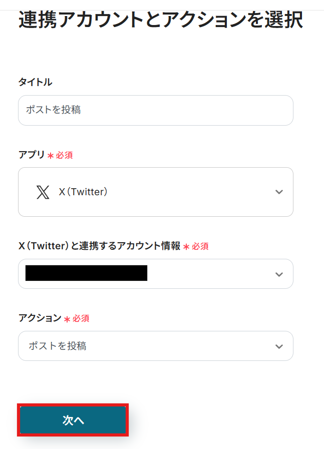 - 最後に、オペレーションでX(Twitter)の「ポストを投稿」アクションを選択。