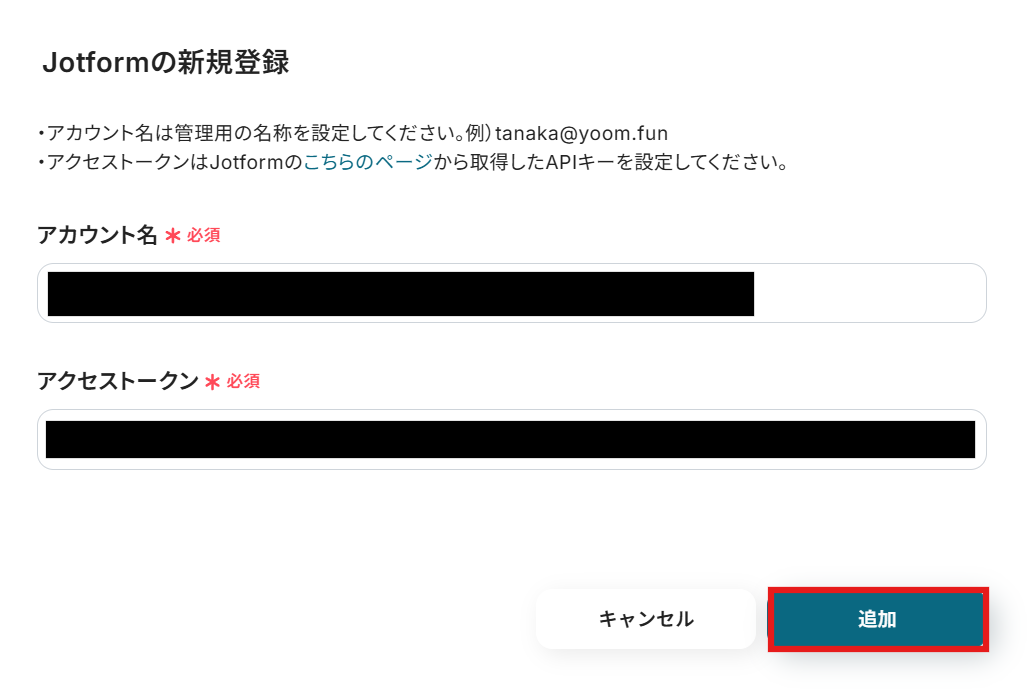 注意事項を参考に、「アカウント名」と「アクセストークン」を入力し、「追加」をクリックしてください。
