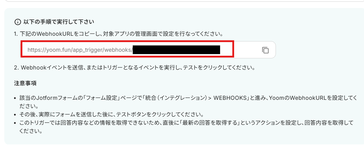 - JotformのWebhook設定方法はこちらをご参照ください。
