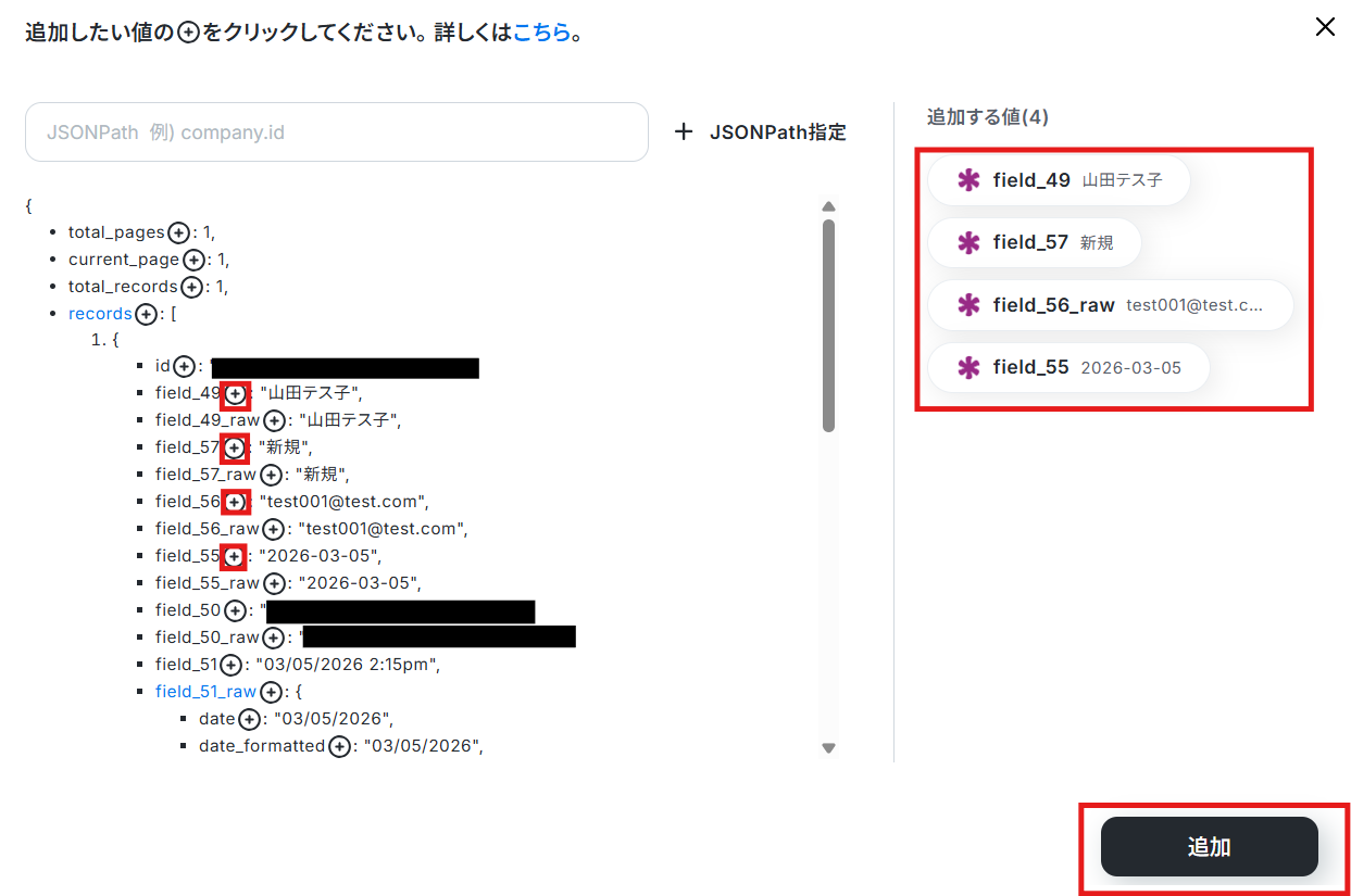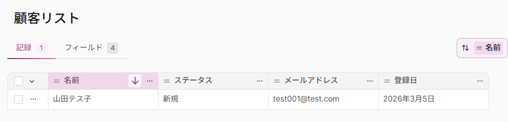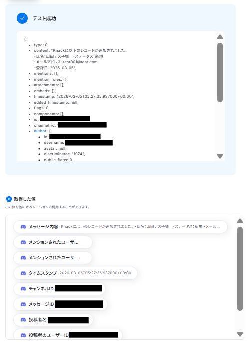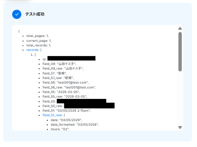 テストが成功すると、先ほどKnackに追加したレコード情報が表示されます。