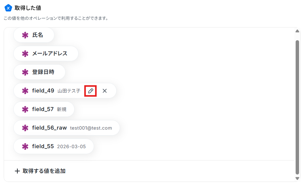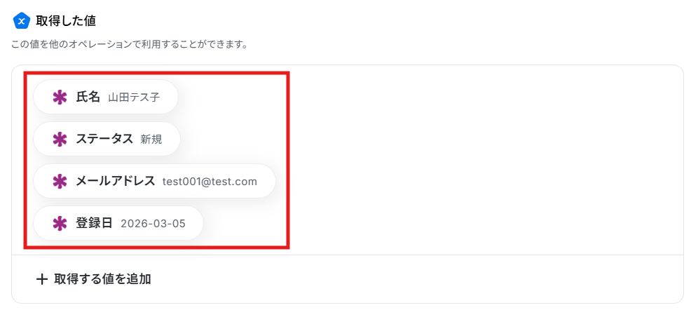 ※取得した値 とは? トリガーやオペレーション設定時に、「テスト」を実行して取得した値のことを指します。 後続のオペレーション設定時の値として利用でき、フローボットを起動する度に変動する値 として引用できます。