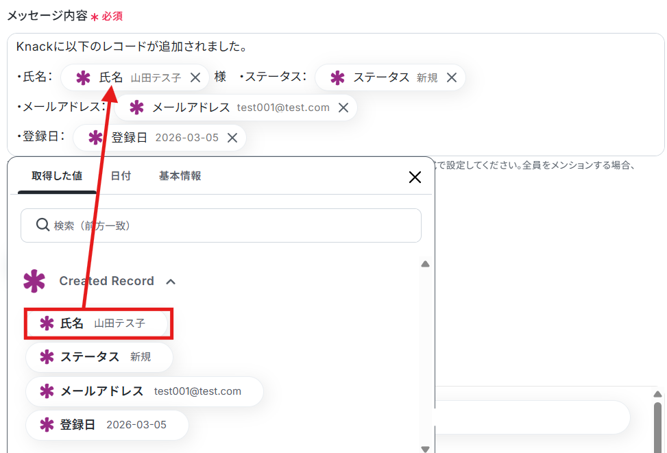 固定値部分 : 「Knackに以下のレコードが追加されました。」「・氏名:様」「・ステータス:」「・メールアドレス:」「・登録日:」