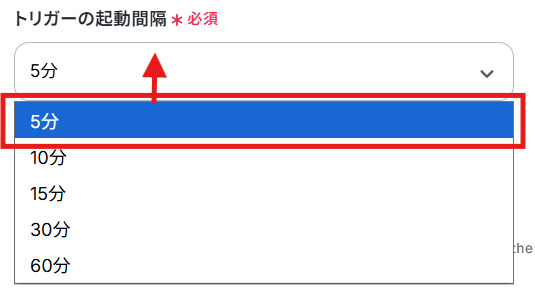 次に、YoomがKnackに追加されたレコード情報を確認する間隔を設定します。 編集欄をクリックし、5分、10分、15分、30分、60分から任意で選択してください。ご利用プラン によって設定できる最短の間隔が異なるため、ご注意ください。 なお、基本的にはそのプランの最短の起動間隔にしてお使いいただくことをおすすめします。