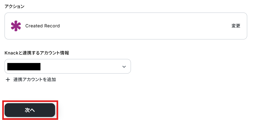 クリックすると以下の画面に移ります。 アカウント情報と書かれた項目にはステップ1でマイアプリ連携した際の情報が記載されています。 アクションは、「Created Record」のままで次に進みましょう!