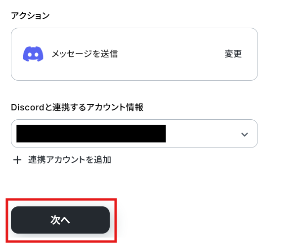 クリックすると以下の画面に移ります。 Knackと同様に、ステップ1でマイアプリ連携したDiscordのアカウント情報が自動で表示されます。 アクションは、「メッセージを送信」のままで次に進みましょう!