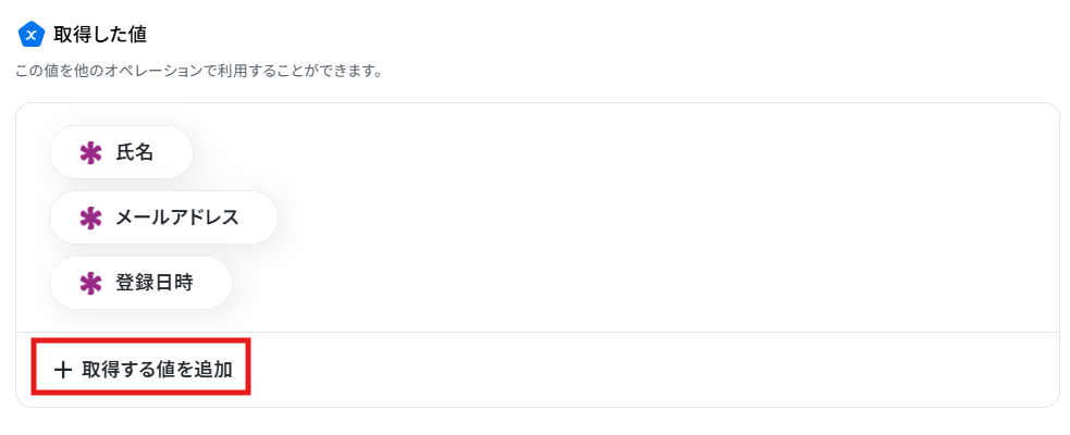 次に、Knackに追加されたレコード情報を「取得した値」として追加します。 「+取得する値を追加」をクリックしてください。