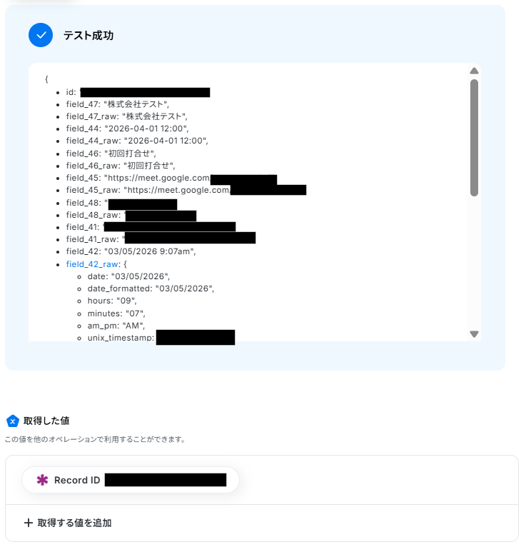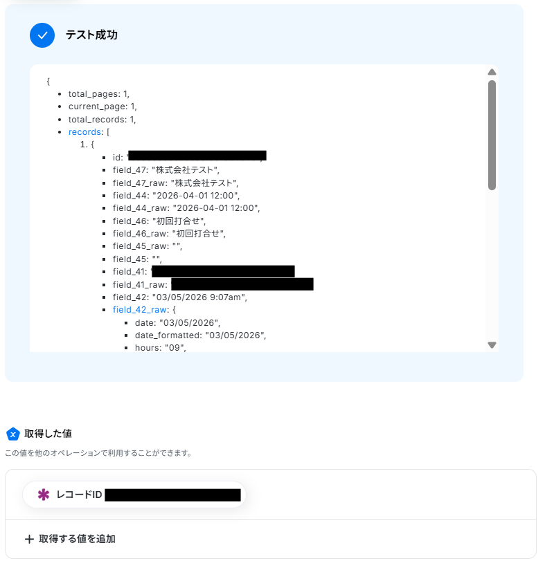 テストが成功すると、取得した値に先ほどKnackに追加したレコードIDが表示されます。 「完了」をクリックして設定完了です!