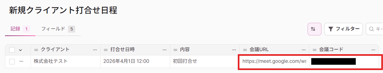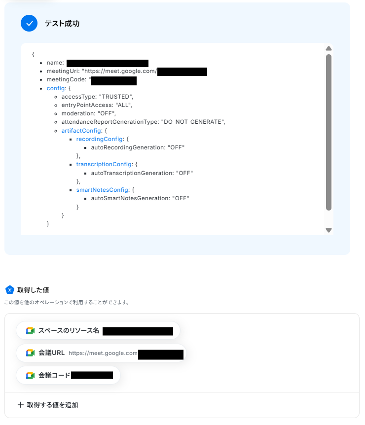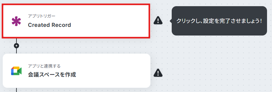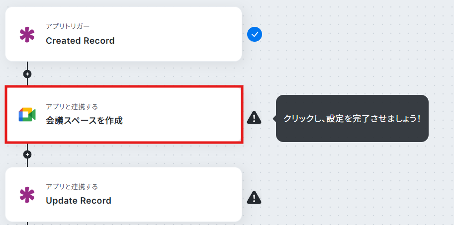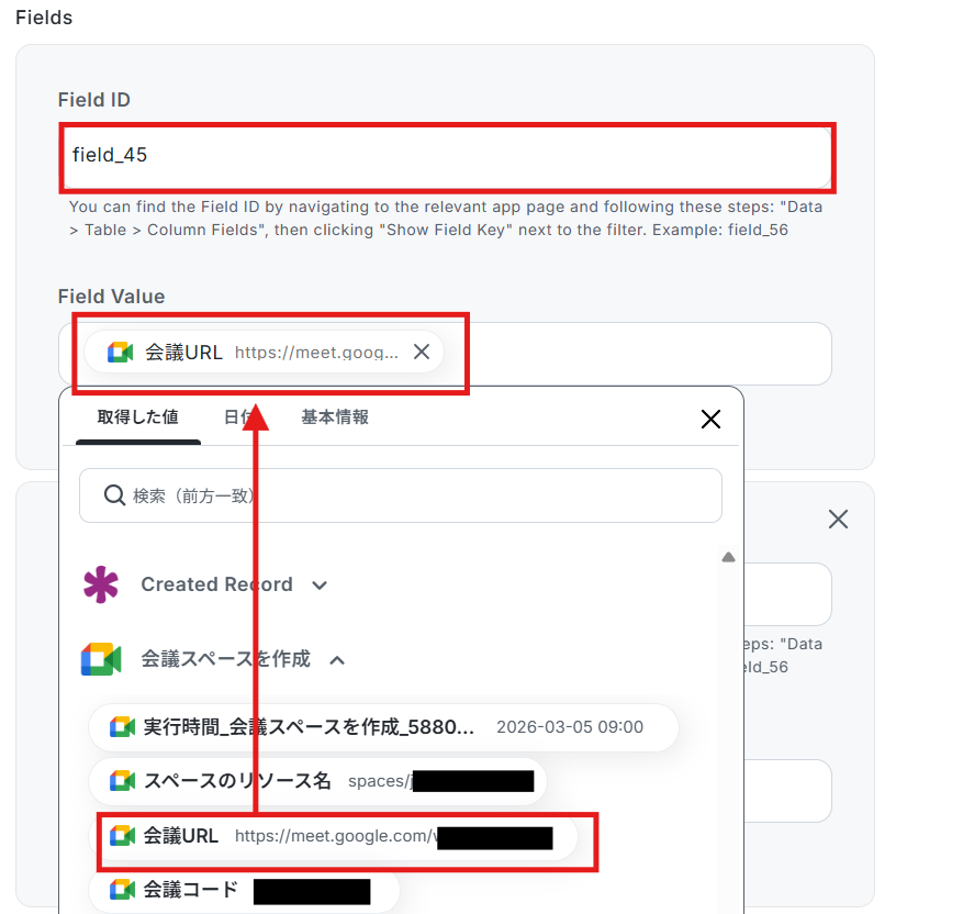 【Tips】 今回のテンプレートでは、Knackでレコードが追加されるとフローボットが起動し、Google Meetでミーティングが作成されます。 さらに、作成されたミーティング情報をもとにKnackのレコードを更新する設定を行います。 そのため、 Google Meetから連携したい情報(会議URL・会議コード・スペースのリソース名)を任意でフィールドに設定してください。 この後、フローボットが動作すると、追加したフィールド情報が自動的に更新されます。